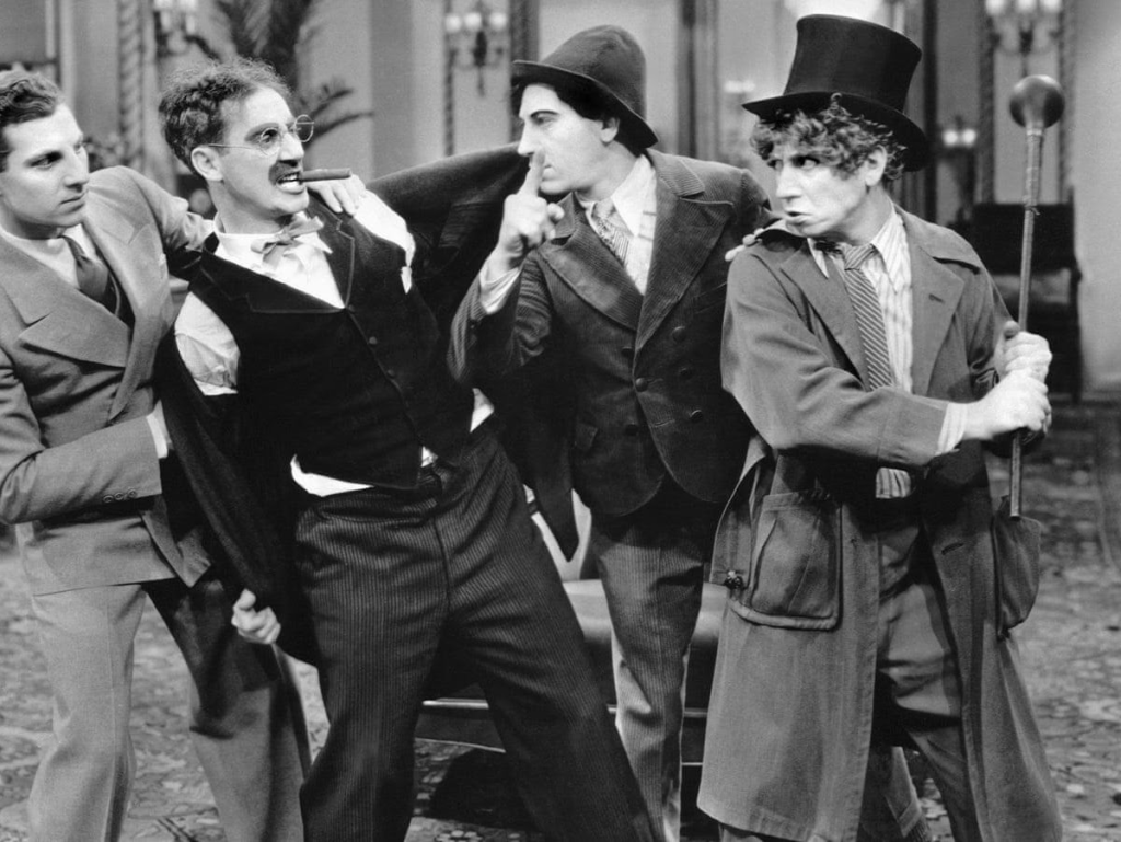 The Marx Brothers were an American family comedy act that was successful in vaudeville, on Broadway, and in motion pictures from 1905 to 1949. Five of the Marx Brothers’ thirteen feature films were selected by the American Film Institute (AFI) as among the top 100 comedy films, with two of them, Duck Soup (1933) and A Night at the Opera (1935), in the top fifteen. They are widely considered by critics, scholars and fans to be among the greatest and most influential comedians of the 20th century. The brothers were included in AFI’s 100 Years… 100 Stars list of the 25 greatest male stars of Classical Hollywood cinema, the only performers to be inducted collectively.