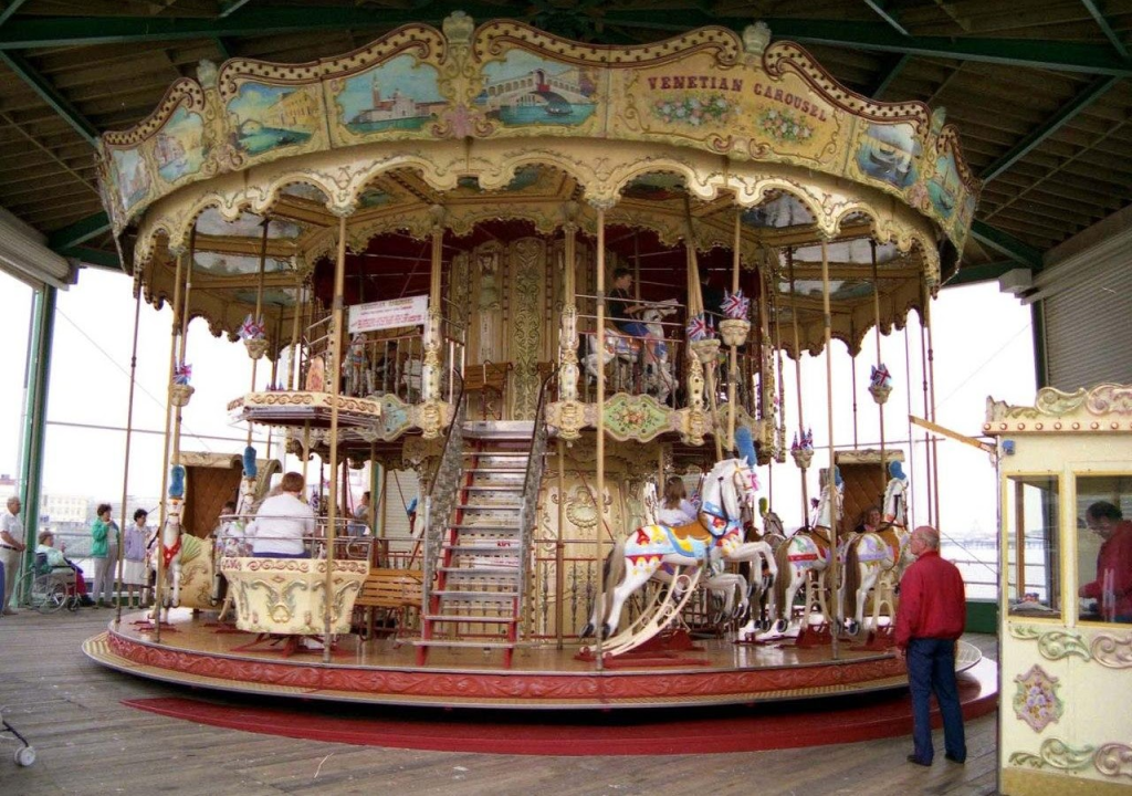The Carousel bar on the pier-head has a Victorian wrought iron canopy, and its outdoor sun-lounge is classified as the largest beer garden in Blackpool. Next to the bar is a two tier carousel, the “Venetian Carousel”, which is protected from sand and spray by a glass wall.